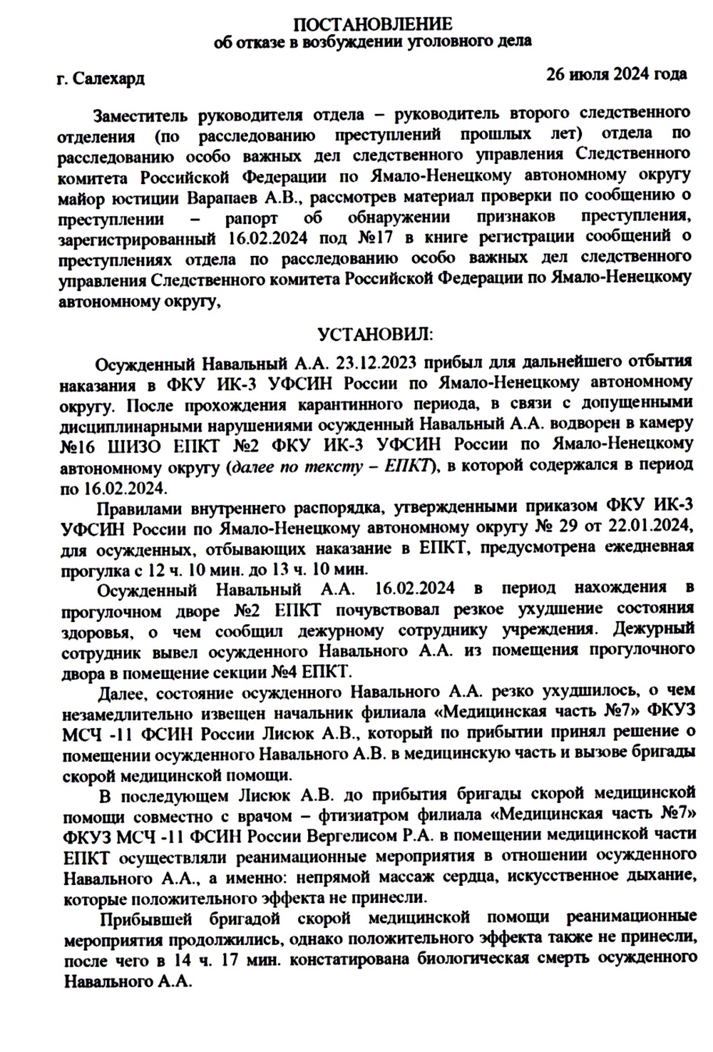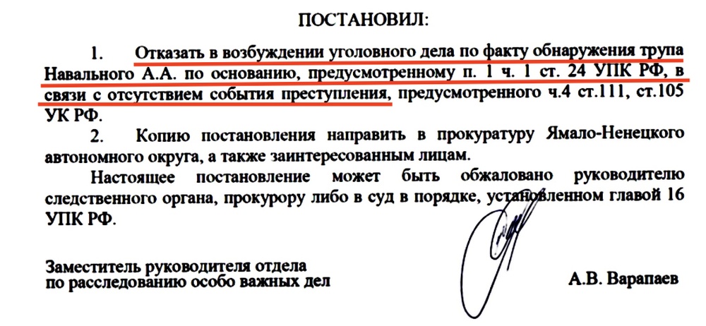 Это постановление Следственного комитета по Ямало-Ненецкому автономному округу. Подписано тем самым майором Варапаевым, который отказывался отдать тело Алексея семье и шантажировал его мать, чтобы та согласилась на тайные похороны.
