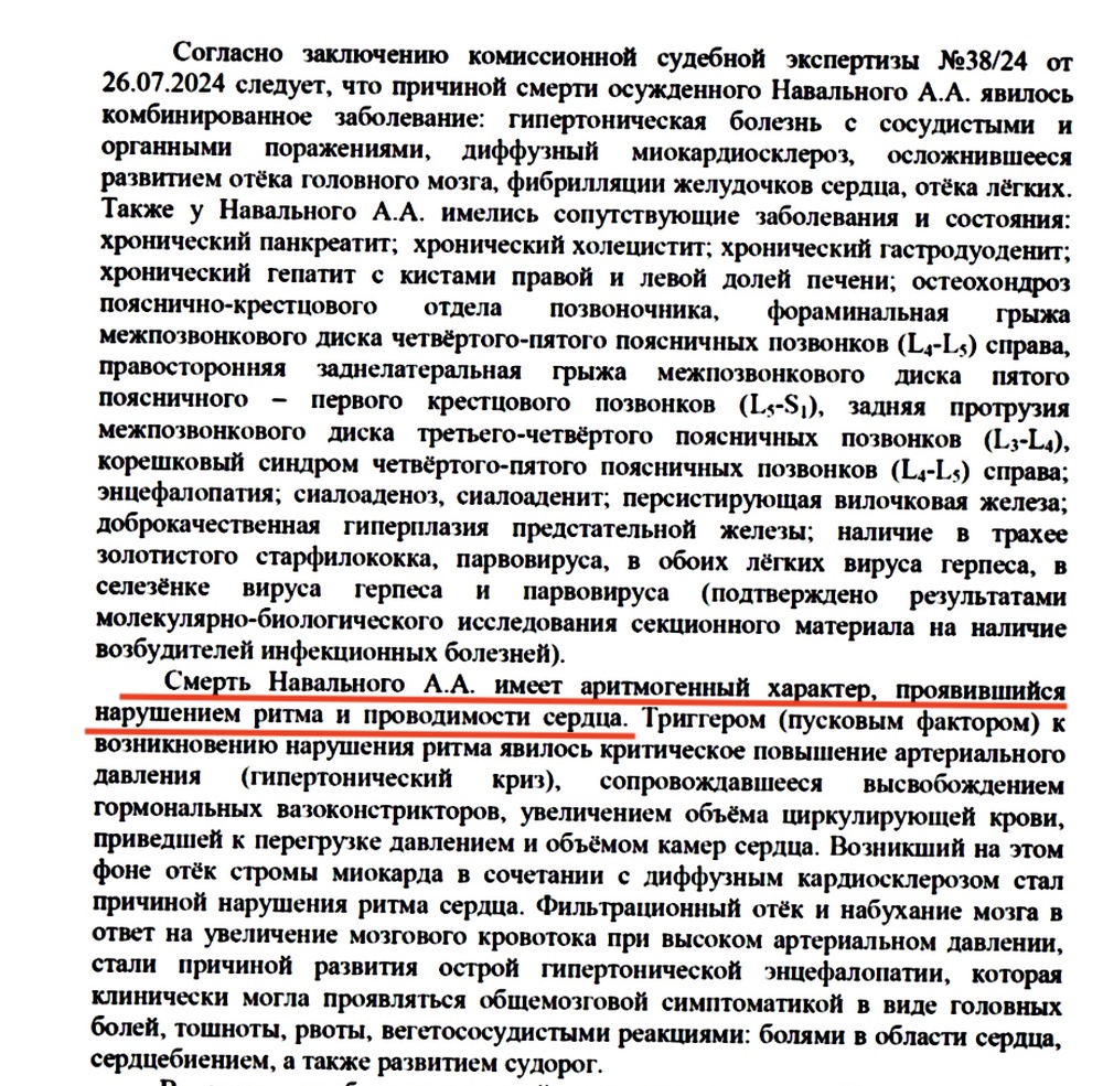 Вот первый и единственный официальный документ, раскрывающий причину и обстоятельства смерти Алексея Навального. Эти три странички я получила на прошлой неделе. То есть через ПОЛГОДА после смерти моего мужа.