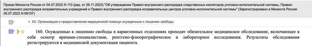 Более того. Вы же помните, что в эту новую колонию в Харпе, Алексея перевели в конце декабря. А это значит, что сразу по приезду его поместили на карантин на две недели. Смотрим, что должно происходить там (по закону):