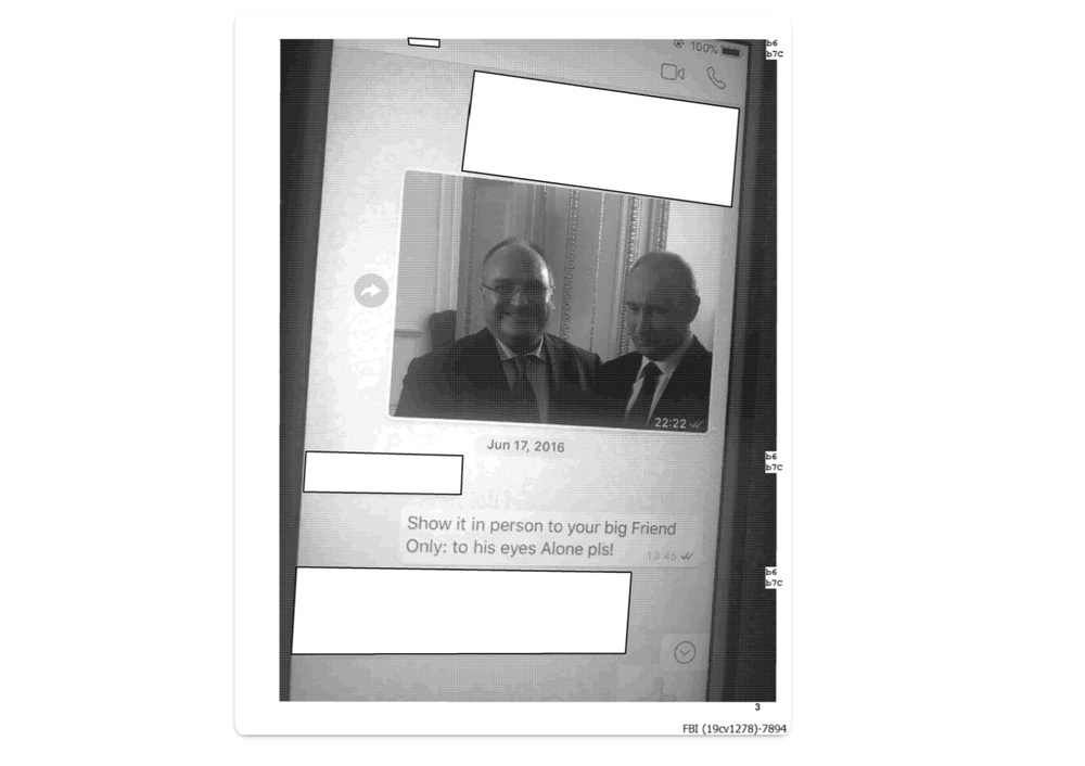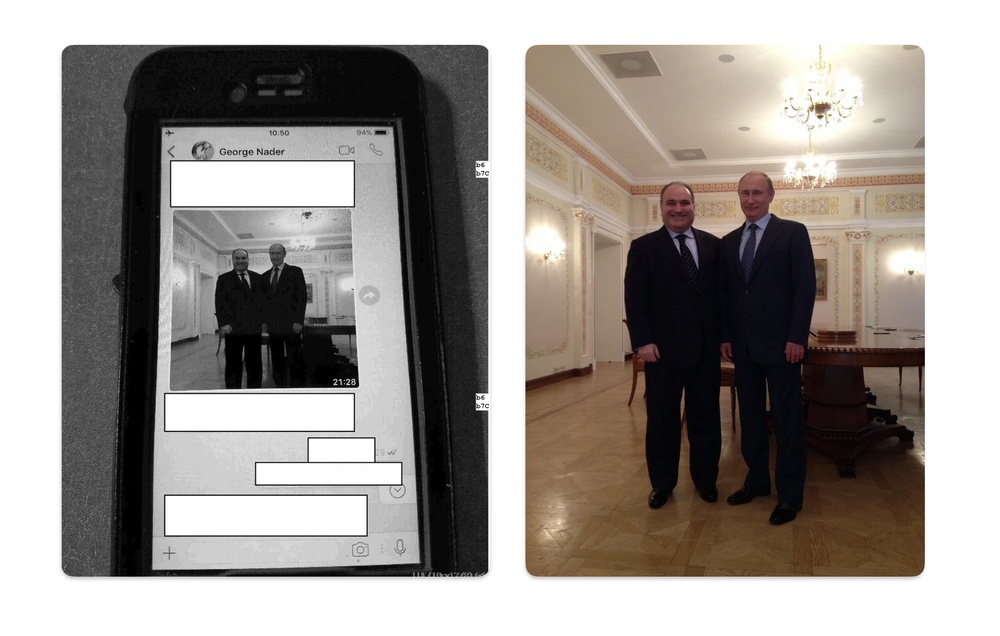 Эти слова были сказаны под присягой, но все равно, нужно проверить. Дмитриева Путин знал — он уже пару лет возглавлял РФПИ. Но мог ли Нейдер, крайне мутный персонаж, преступник, иметь доступ лично к Путину и его официальным представителям? Похоже, что да. В рассекреченных файлах ФБР есть черно-белая фотография телефона, на котором видно снимок какого-то мужчины с Путиным. Мы нашли оригинал этой фотографии, и это и есть Джордж Нейдер.