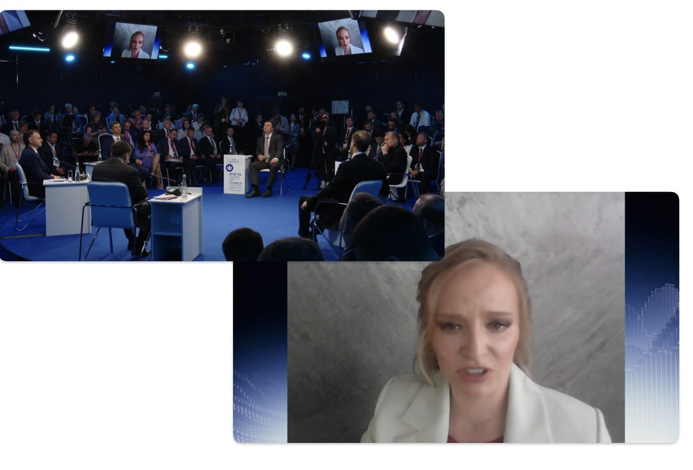 И то же самое с ее начальницей Тихоновой, дочерью Путина. Вот отличный пример: Соловьев объявляет на форуме: «Выступает Катерина Тихонова» — кто она, почему выступает, в чем ее экспертиза? Она, не удосужившись поднять глаза от написанного текста, просто читает что-то с экрана — пустые, ничего не значащие слова: «технологический инновационный интегратор», «совокупный суверенитет». Там такое плохое качество связи, что половину времени ее не слышно вообще, но министры и губернаторы, открыв рот, смотрят на нее снизу вверх — как будто это какой-то гений и самый важный в мире человек.