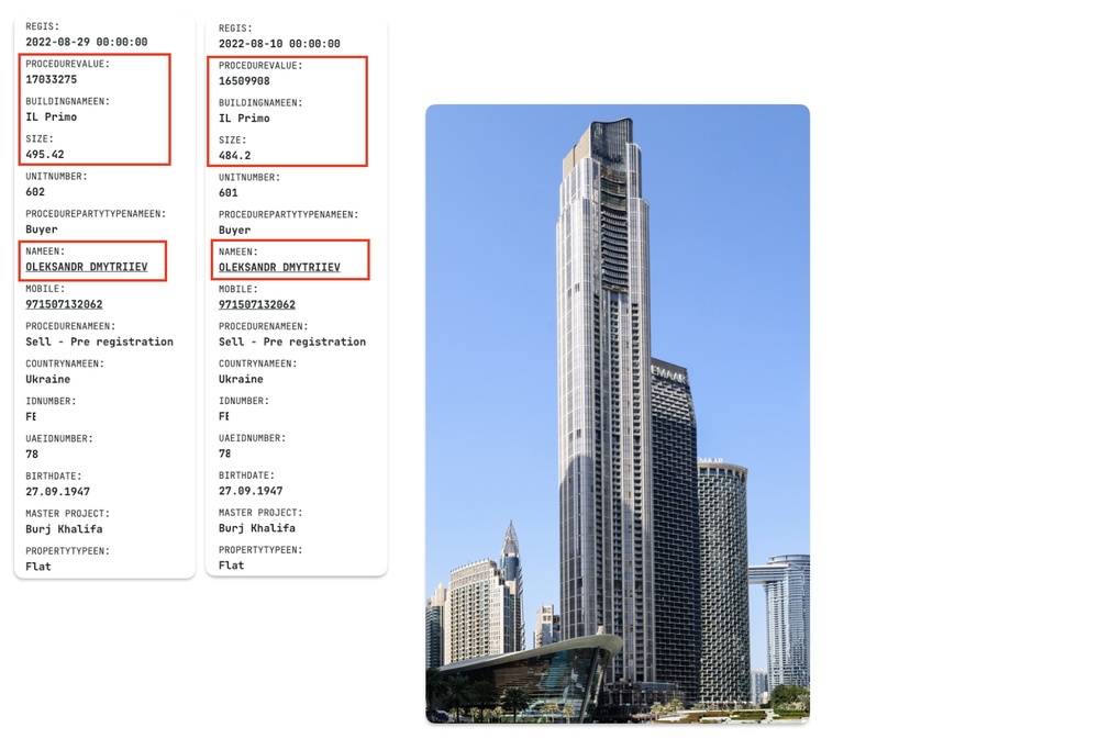 Но всё равно, на всякий случай они решили подстраховаться. Мы обнаружили, что в августе 2022 года, через полгода после начала войны, 75-летний биолог Олександр Дмитриев решил диверсифицировать своё портфолио недвижимости и прикупить что-то в Дубае. В этот раз на него оформили две соседних квартиры общей площадью, внимание, 980 квадратных метров. Они занимают целый этаж в жилом комплексе IL Primo района Burj Khalifa. Стоимость на момент покупки — почти 8,5 миллиона евро.