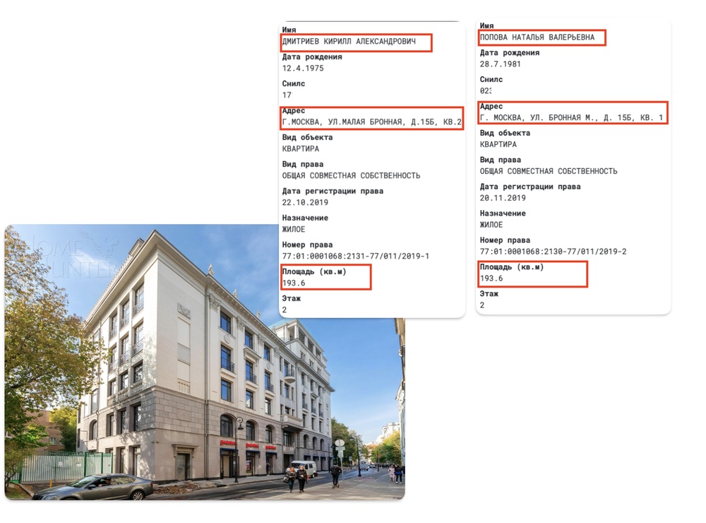 А за год до этого наша семейка разжилась еще более солидной квартирой. Наверное, в одном из самых дорогих домов Москвы — на Малой Бронной. Один квадратный метр тут стоит, внимание, 4,5 миллиона рублей. Две соседние квартиры, которые Дмитриев и Попова купили в 2019 году, стоят, соответственно, 1,8 миллиарда рублей.