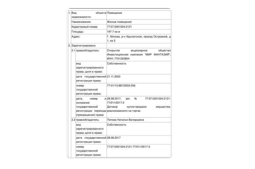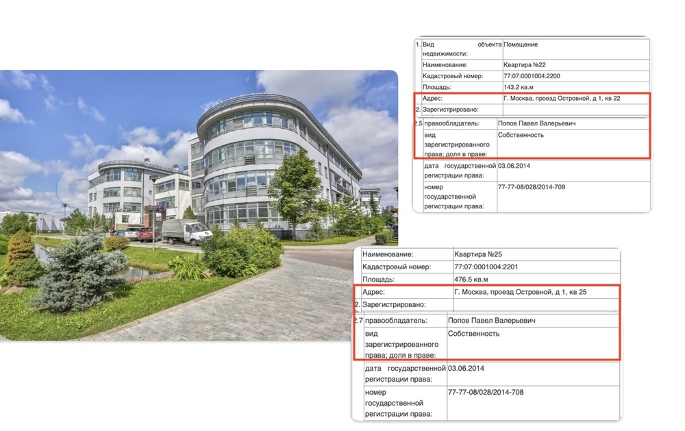 Часть недвижимости Дмитриев с Поповой записывают не на себя. Например, две квартиры (1,2) в ЖК «Остров фантазий», которые вместе образуют трехэтажную суперквартиру площадью 620 квадратных метров, купил в 2014 году брат Натальи Поповой — Павел, тоже сотрудник «Иннопрактики».