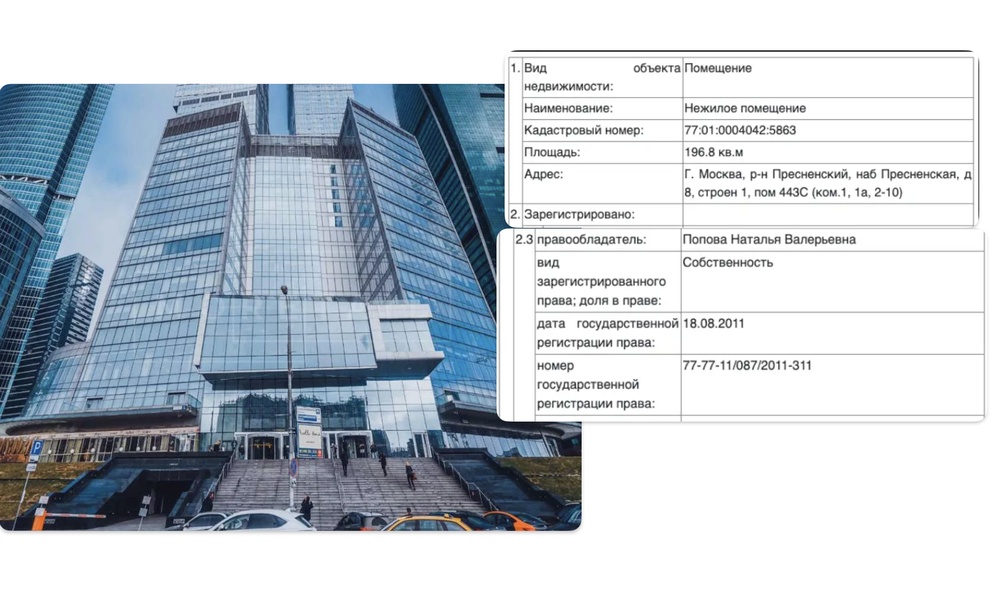 Уже в августе 2011 года, через несколько месяцев после прихода Дмитриева в РФПИ, его супруга Наталья Попова покупает 200-метровое помещение на 44-м этаже комплекса «Город столиц» в Москва-Сити за 157 миллионов рублей.