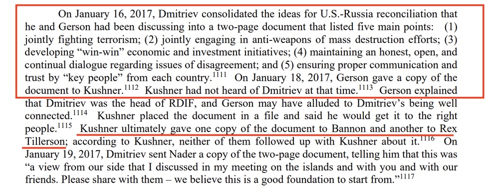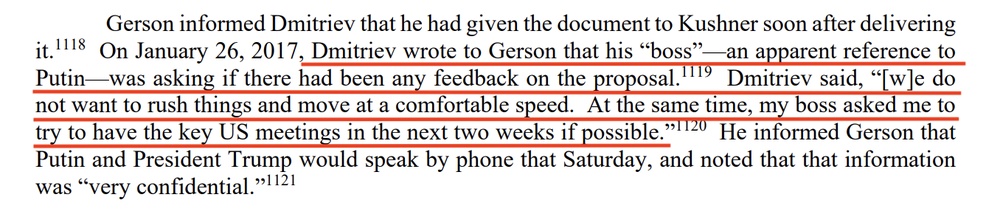 Кроме встречи на Сейшелах, в отчёте спецпрокурора Мюллера упоминается ещё одна дипломатическая потуга Дмитриева — встреча с ещё одним знакомым Нейдера, американским инвестбанкиром Риком Герсоном. Его ценность в том, что он — близкий друг зятя Трампа, Джареда Кушнера, и, соответственно, вхож в команду Трампа.