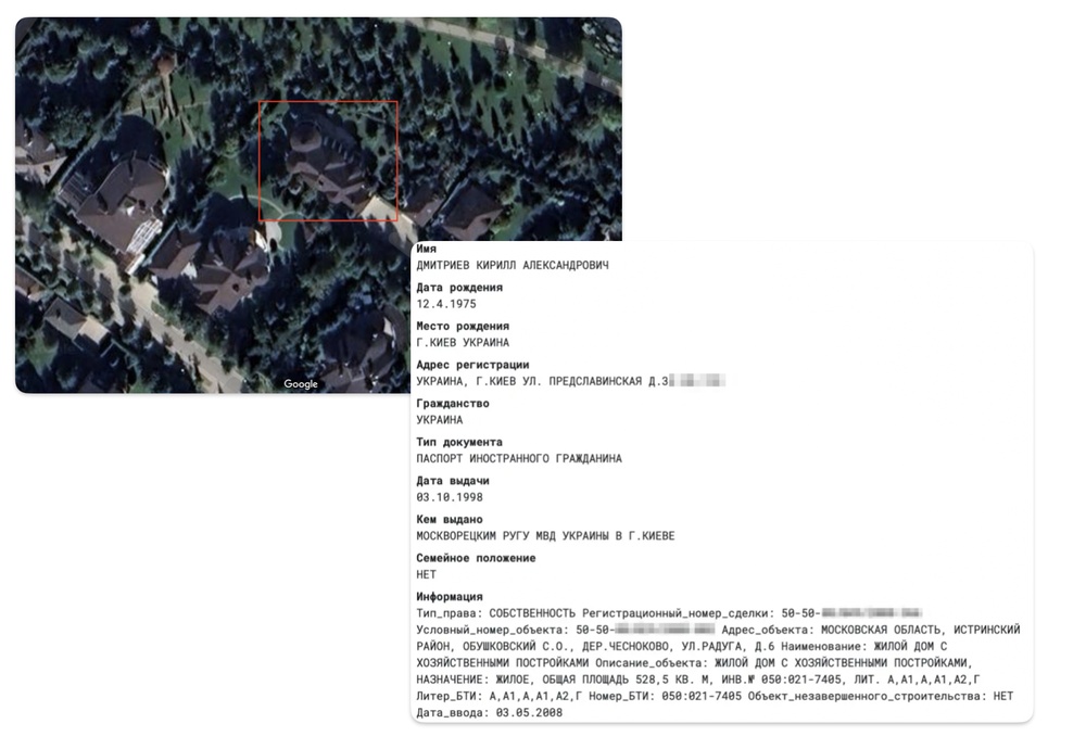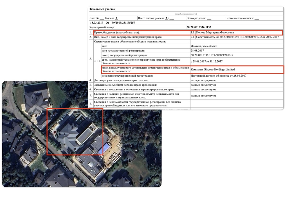 Ну и, конечно, путинский чиновник должен иметь солидную дачу. Свой новый особняк Дмитриев записал по-старинке на тёщу. Владелицей полуторатысячеметрового дома в самом сердце Рублёвки, в Барвихе, в 2017 году стала 70-летняя Маргарита Фёдоровна Попова, мать Натальи Поповой. Стоит такой дом сейчас 1 миллиард 250 миллионов рублей. Деньги на покупку дома пенсионерке выдал кипрский офшор Giscono Holdings Limited.