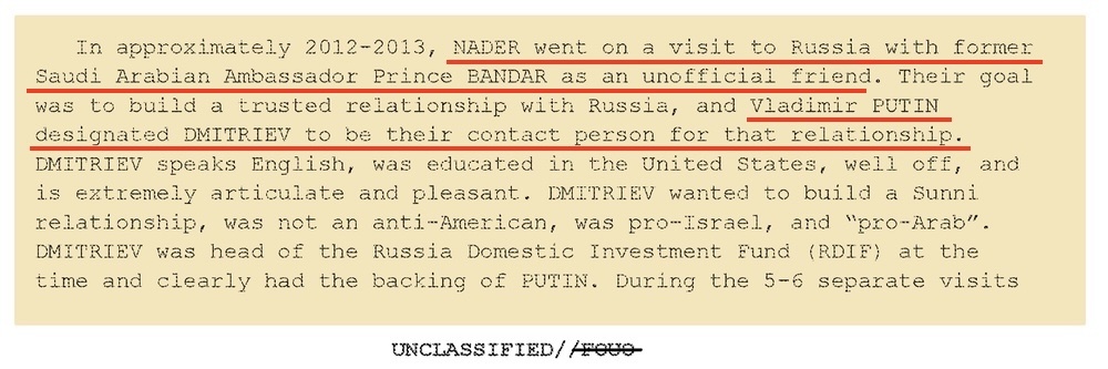И педофил Джордж Нейдер, который был советником и главы Эмиратов, и главы Саудовской Аравии, занимался чем-то похожим. А свел их Путин в 2012 или 2013 году, когда Нейдер прилетел в Россию вместе со своим другом — бывшим послом Саудовской Аравии. Путин, так в своих показаниях рассказывает Нейдер, сказал, что для выстраивания дипломатических отношений с саудитами у него есть специальный человек, общаться нужно через него — и это Кирилл Дмитриев.
