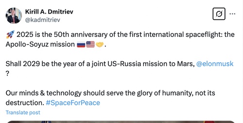 Нас в первую очередь интересует, конечно же, Кирилл Дмитриев — глава Российского Фонда Прямых Инвестиций (РФПИ), который в последние несколько недель все чаще и чаще мелькает на экранах. Он — один из участников переговоров России и США по Украине. 23 февраля Путин неожиданно назначает его своим спецпредставителем по экономическому сотрудничеству с зарубежными странами. Он раздает интервью и даже завел аккаунт в запрещенной в России соцсети Твиттер, где он пытается общаться с Илоном Маском: ставит ему аплодирующие смайлики, предлагает ему сотрудничество: мол, Илон, как насчет совместной миссии на Марс в 2029 году?