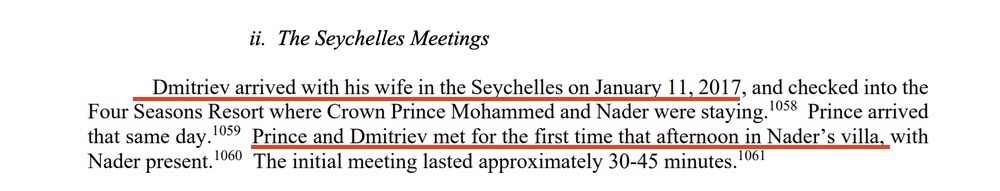 По приглашению Нейдера Дмитриев оказался в 2017 году на Сейшелах, в одном отеле со спонсором и приятелем Трампа Эриком Принсем. Это не могло быть совпадением или ситуацией, когда два человека случайно пересекаются во время завтрака в гостинице и узнают друг друга.