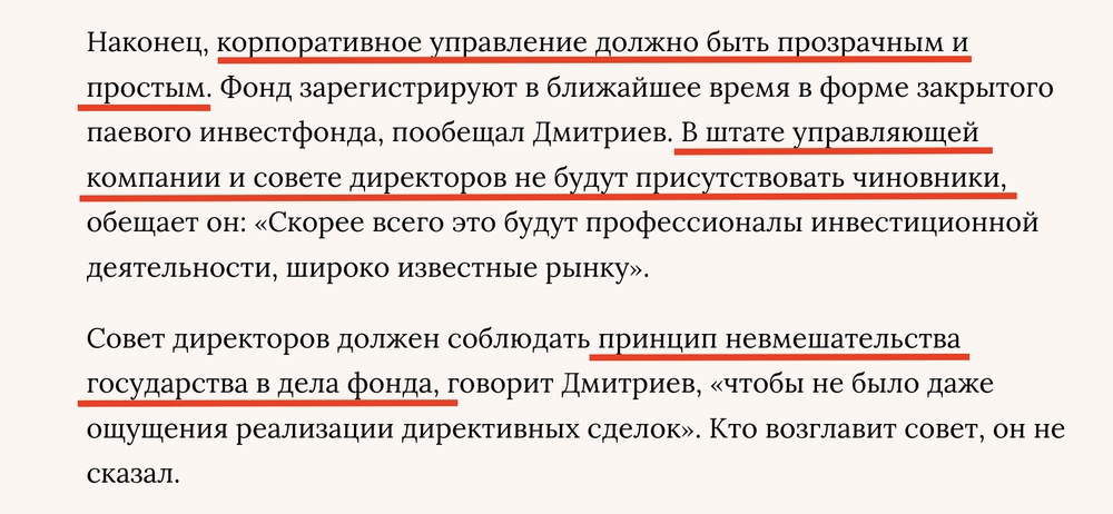 Идея в 2011 году звучала вполне нормально. Если почитать заметки того времени, то это прямо мечта: в госфонде будут работать только опытные, известные финансисты из реального бизнеса, а большая часть штата и вовсе будут иностранцы. Впечатляющий экспертный совет. А инвестировать будут не в добычу полезных ископаемых, а во что-то модное и технологичное — в IT или космос. Ну и главное — полная прозрачность.