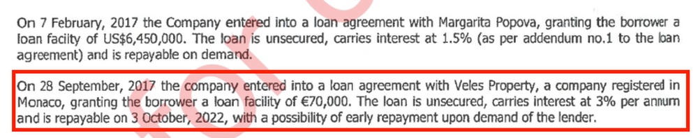 Еще упоминается займ некой компания Велес Проперти из Монако