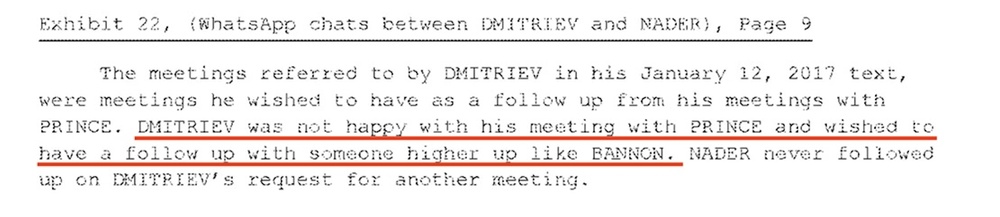 После встречи с миллиардером Принсем Дмитриев жаловался Нейдеру, что он остался недоволен и разочарован, и требовал познакомить его с кем-то более влиятельным в команде Трампа, чем Принс.