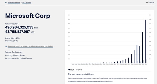 В списке 8659 компаний. Можно кликнуть любую и посмотреть общую сумму, разбивку по годам, динамику стоимости. По дополнительной ссылке на странице можно почитать как представители фонда голосуют на каждом собрании акционеров Microsoft. И так по всем компаниям из большого списка.