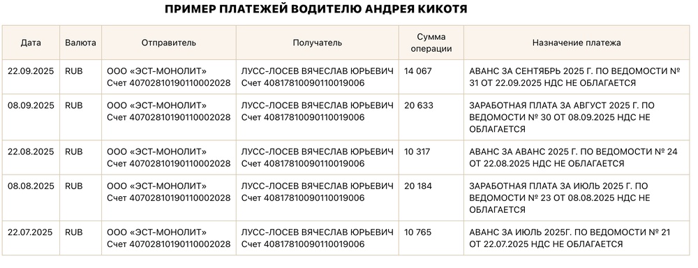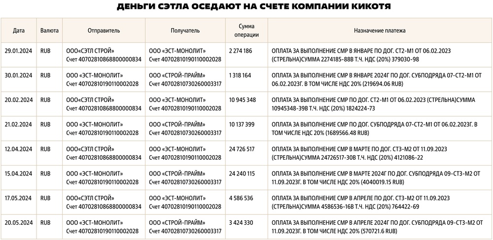 Всего с 2024 года на счёт фирмы «Эст-Монолит» поступили деньги за около 100 таких «строительных подрядов» от одного клиента на общую сумму 1,2 миллиарда рублей. От каждого из них фирма Кикотя забирала себе от 3 до 10 процентов, и таким образом на счетах «Эст-Монолит» осело около 66 млн рублей за полтора года.