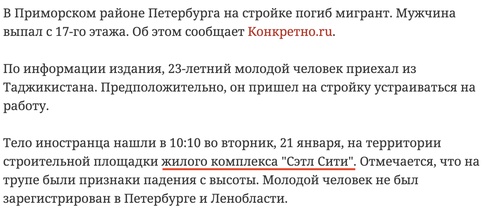 Читаем петербургские новости. Они пестрят сообщениями о том, что на стройках «Сэтл Групп» постоянно погибают мигранты: июнь этого года, плотник из Узбекистана сорвался с 12 этажа, он был трудоустроен в подрядной организации, кто несет ответственность — непонятно.
