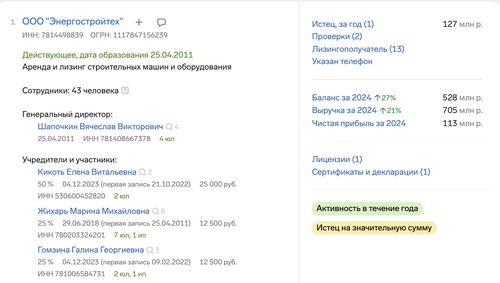 В этой фирме жена Кикотя и акционер и сотрудник — в виде зарплаты и дивидендов она получила от ООО «Энергостройтех» 34 млн рублей с 2024 года.