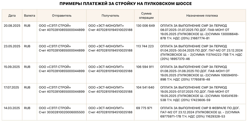 В проводках фирмы Кикотя мы видим, что его «Эст-Монолит» получает деньги за строительство, скорее всего, именно этого объекта: в описании проводки — «Пулковское шоссе, 2». В этом районе есть два жилых квартала, и оба их строит «Сэтл Групп» Шубарева.