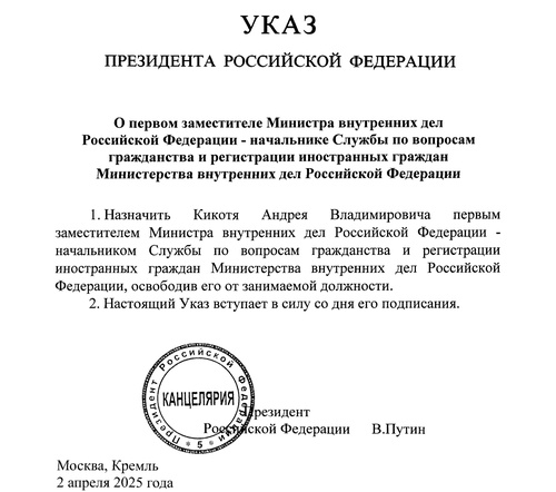 Просто для контекста: коллеги Кикотя, другие заместители генпрокурора, были старше его в среднем на 20 лет. Кикоть сохранил должность и после ухода Чайки, при Краснове. И вот в этом году, Путин лично дает ему звание генерал-полковника и назначает первым заместителем министра внутренних дел, ответственным за миграцию.