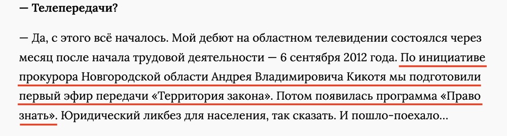 Андрей Кикоть, как рассказывает его будущая супруга, придумал, что она должна вести передачу на областном телевидении и рассказывать там про успехи местной прокуратуры.