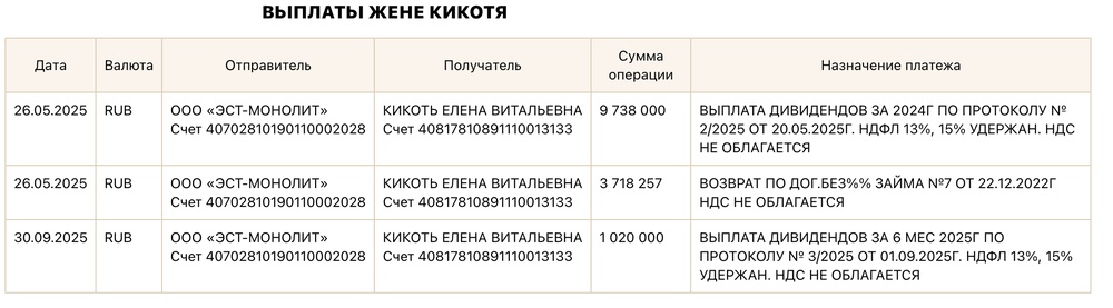 Ну а то, что осталось после этого, переводится жене Кикотя как дивиденды или «возврат долгов» — всего 14,5 млн.