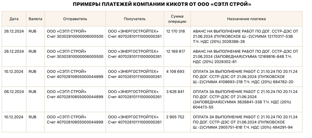 А второй клиент уже прекрасно знакомая нам «Сэтл Строй» Шубарева. Несмотря на то, что «Энергостройтех» занимается вроде как энергетикой в регионах, «Сэтл Строй» упорно платит им за строительно-монтажные работы на своих объектах в Санкт-Петербурге. Всего за известный нам период — 266 млн.