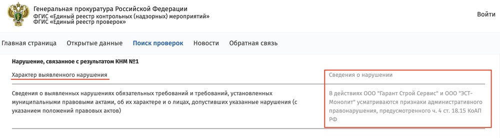 Но даже это еще не все. Во время одной из проверок на стройке «Сэтл Групп», в поле зрения полиции попали и их подрядчики; в том числе, фирма Кикотя «Эст-Монолит». У них нашли нарушения и выписали протокол.
