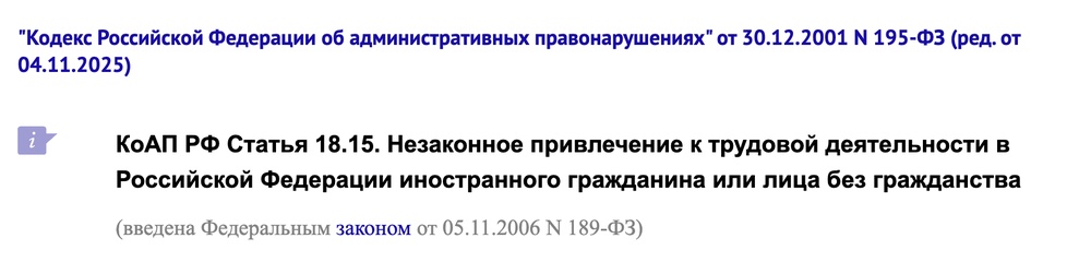 По статье... 18.15 КоАП РФ — незаконное привлечение к трудовой деятельности иностранных граждан. Да, глава миграционной службы сам в свою собственную фирму привлекает нелегальных мигрантов.