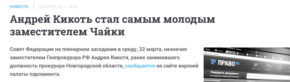 В 40 лет новое повышение: Кикотя назначают заместителем генерального прокурора России (Юрия Чайки).