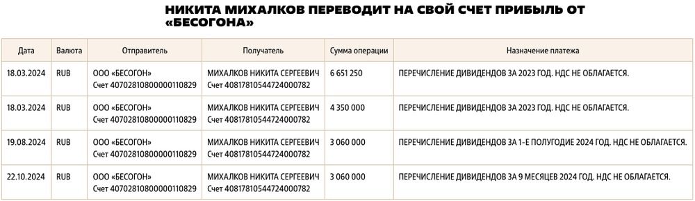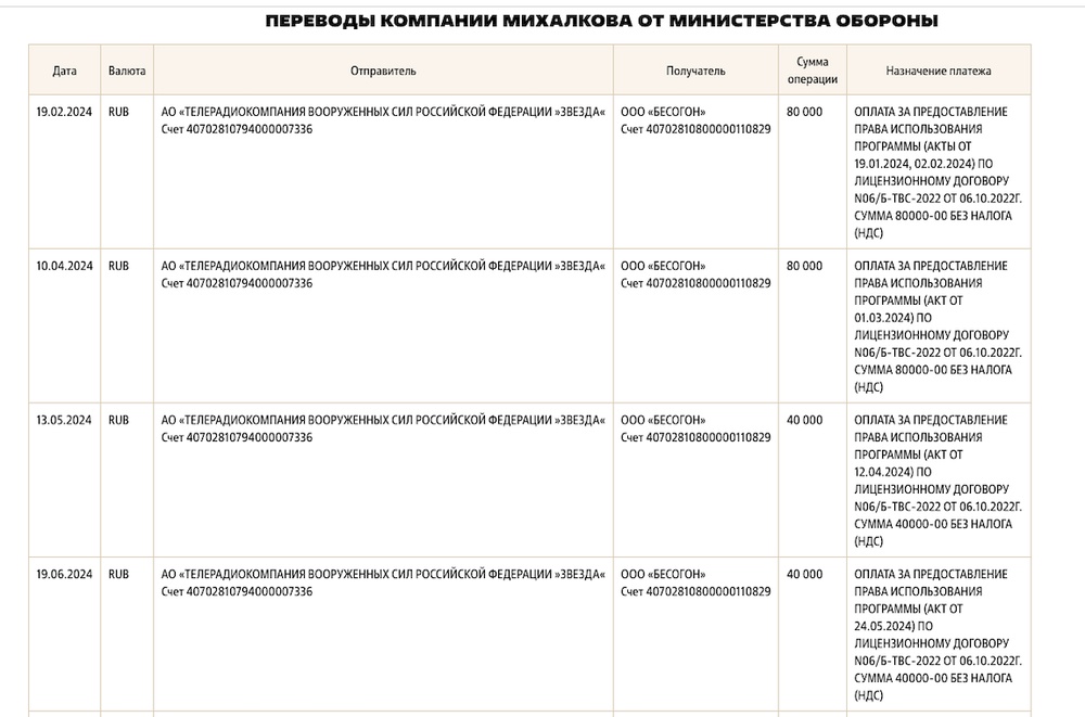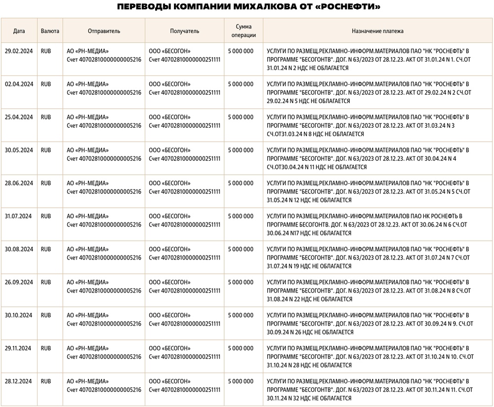 Мы выяснили, что каждый выпуск «Бесогона» оплачивает… российская государственная компания Роснефть. Как минимум с начала 2024 года Роснефть платит фирме Михалкова ровно 5 миллионов рублей за каждую передачу. Переводы маскируются под оплату размещения рекламно-информационных материалов нефтяной компании Роснефть.
