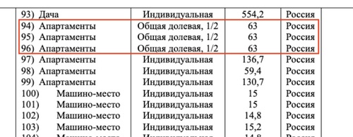 Сначала видим впечатляющий список на 3 страницы: 86 пунктов — это все земельные участки, которые принадлежат Михалкову, всего 30 миллионов квадратных метров. Потом указаны жилые дома, нежилые помещения, гаражные места и так далее. Следующий столбец декларации — местонахождение недвижимости, и везде тут: Россия, Россия, Россия. Но остановимся вот на этих трёх строках: три небольшие квартиры по 63 метра каждая.