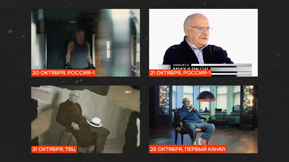 21 октября. Фильмы про Михалкова выходят на России-1 и ТВЦ, а по Культуре начинают каждый день крутить его работы и программы про него. 25 октября, в субботу, день Михалкова на Первом канале: там выходит фильм «Портрет в интерьере», две части фильма идут почти 3 часа. А в перерывах между частями документального суперфильма на Первом показывают михалковский «Свой среди чужих, чужой среди своих».
