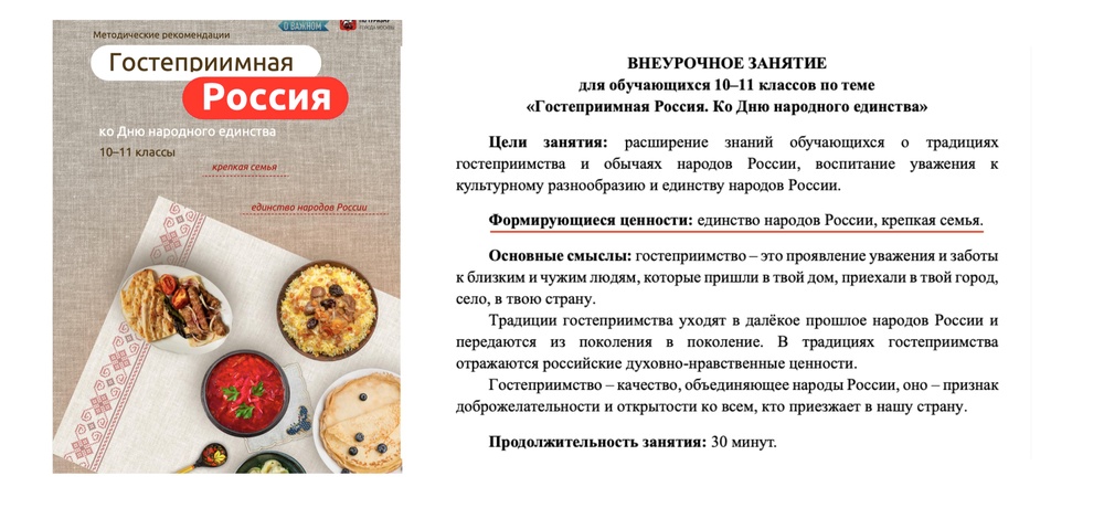 Разберем одну из методичек, чем-то похожую на меню ресторана. На этом «уроке о важном» старшеклассников учат традициям гостеприимства и обычаям народов России. Есть список ценностей, которые надо у школьников сформировать: единство народов России и крепкая семья.