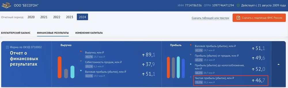 В общем, дела у «Бесогона», как у бизнеса, идут очень хорошо. За 2024 год чистая прибыль компании, которая выпускает только эту передачу, составила 46,5 миллиона рублей.