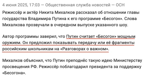 То же самое повторяется ещё много раз. В «Разговорах о важном» в декабре 2024 года ученики слушают кусочек «Бесогона», где Михалков приравнивает возвращающихся из Украины военных к героям Великой Отечественной. А на следующем уроке, посвящённом написанию законов, школьникам показывают видео, где Михалков критикует желание Украины вступить в Евросоюз.