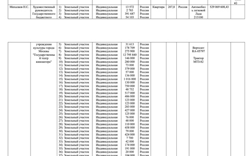 Давайте посмотрим декларацию о доходах Никиты Сергеевича Михалкова. Это единственная его опубликованная декларация. Дело в том, что он вообще-то руководитель бюджетного учреждения — художественный руководитель театра в Москве. Вскоре после назначения его декларацию опубликовали. В ней обнаружился доход в полмиллиарда рублей, миллионы квадратных метров личной земли и даже вертолёт.