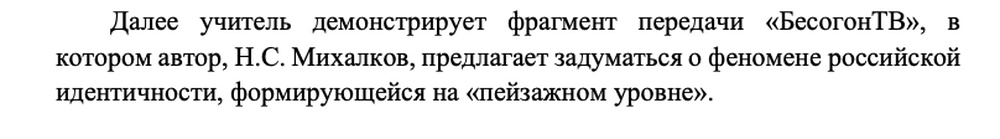 В определенный момент учитель говорит: «Для многих в мире Россия феноменальна тем, что на одной земле мирно уживаются абсолютно разные народы со своей культурой, со своим вероисповеданием». А дальше почему-то преподаватель должен рассказать, что на эту тему думает Н.С. Михалков. Затем (тут никакой дискуссии с учениками прописано) учитель включает телевизор и показывает детям фрагмент передачи «Бесогон».