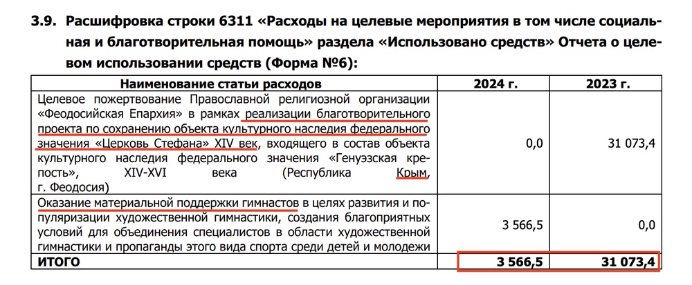 Чуть больше информации о деятельности есть в отчетах подписанных самой Кабаевой. Но там даже приблизительно нет никаких потраченных миллиардов. Например, они оказывают некую помощь гимнастам, прекрасное дело, но на это ушло только 3,5 миллиона рублей. 1/10 процента от полученных денег.