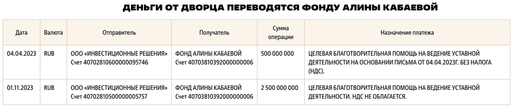 4 апреля 2023 года компания «Инвестиционные Решения» пожертвовала 500 миллионов рублей Фонду Алины Кабаевой. 1 ноября — еще 2,5 миллиарда, то есть всего 3.